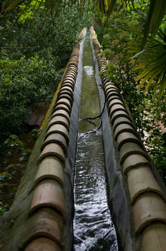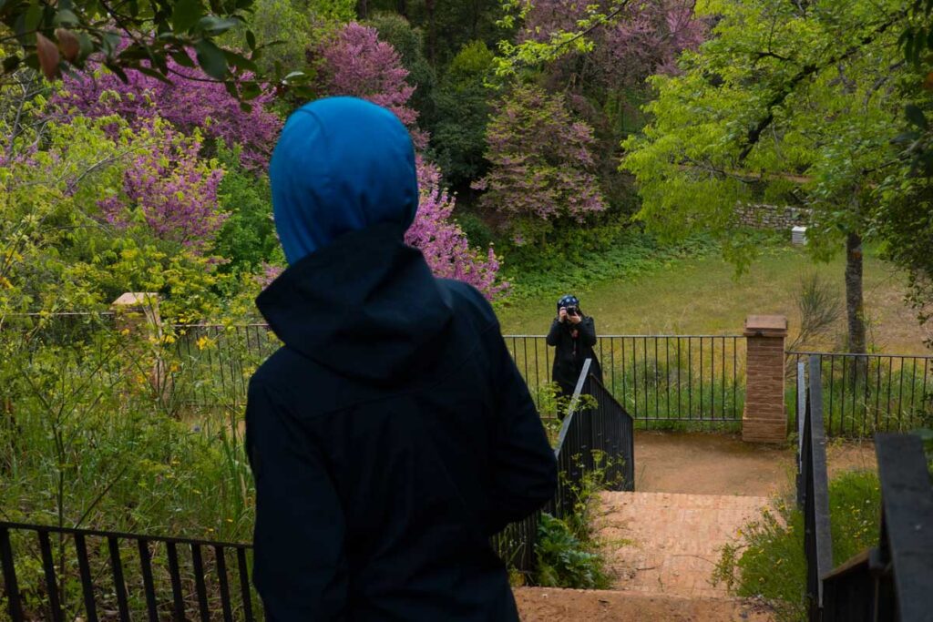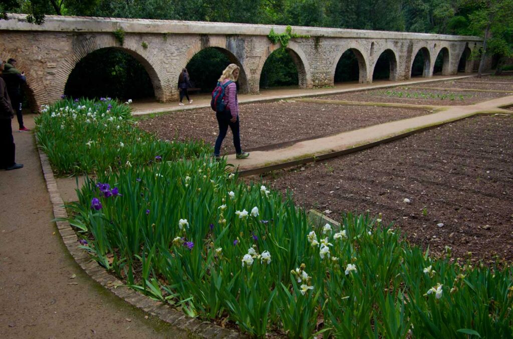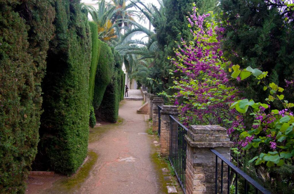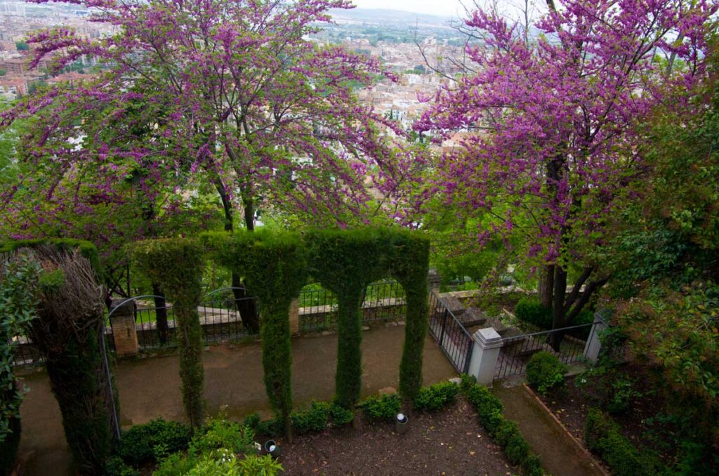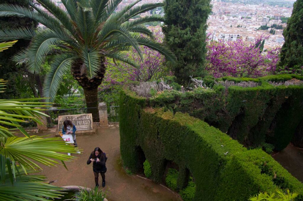 On aprillikuu, mis Andaluusias imekaunis juudapuude õitsemise aeg. Väravas tervitavad meid räuskavad paabulinnud. Edasi tuleb eluhoone, klassikaline mauri stiilis sisehoov – kaared, mosaiigid, madalad basseinid. Ümberkaudu mitmel tasandil terrassid, pügatud hekimustrid, purskkaevud, veekanalid, visteeriaõites pergolad. Aga barokkpargi ranguse asemel on siin veetlev mängulisus ja muinasjutu-õhkkond. Tuhat ja üks ööd. Sümmeetria saab lõhutud, loodus läheb sujuvalt üle arhitektuuriks (ja vastupidi), radu mööda edasi liikudes avanevad järjest uued vaated – aed on nagu seitsme looriga tantsijanna. Õitsevad kallad ja iirised. Linn on kusagil kaugel all, silmapiir kaob vinesse. Aeg peatub.