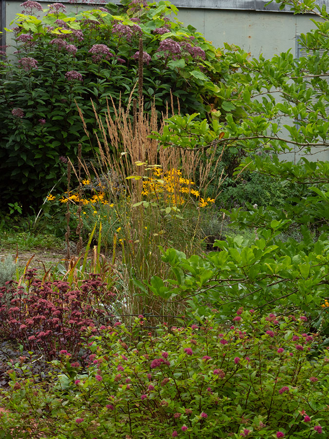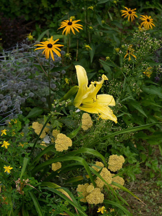Järgnevad pildid tegin Tuljaku aias; selle võluva kollase segu autor on, kui ma ei eksi, Lylian Meister. Mind veetleb eriti, kuidas on siin lisaks värvikontrastile tööle pandud ka värvilaikude heleduse, suuruse ja intensiivsuse kontrast. Raamistiku Lyliani mängule on loonud minu lemmikarhitekt Valve Pormeister.